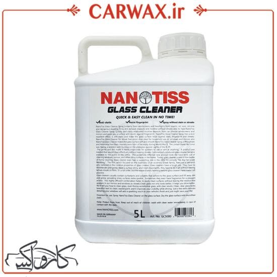 مایع 5 لیتری شیشه پاک کن نانوتیس Nanotiss Glass Cleaner برای از بین بردن انواع آلودگی ها از سطح شیشه خودرو شما مناسب می باشد.