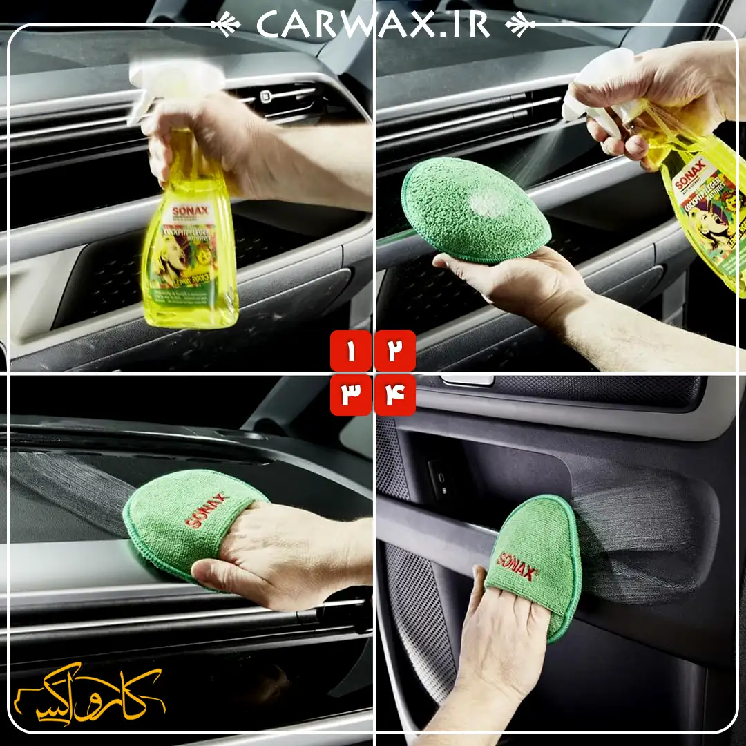 - تمیز کردن اولیه سطح: با یک دستمال میکروفایبر با رطوبت کم، گرد و غبار و آلودگیهای سطحی را از داشبورد و پلاستیکها پاک کنید.